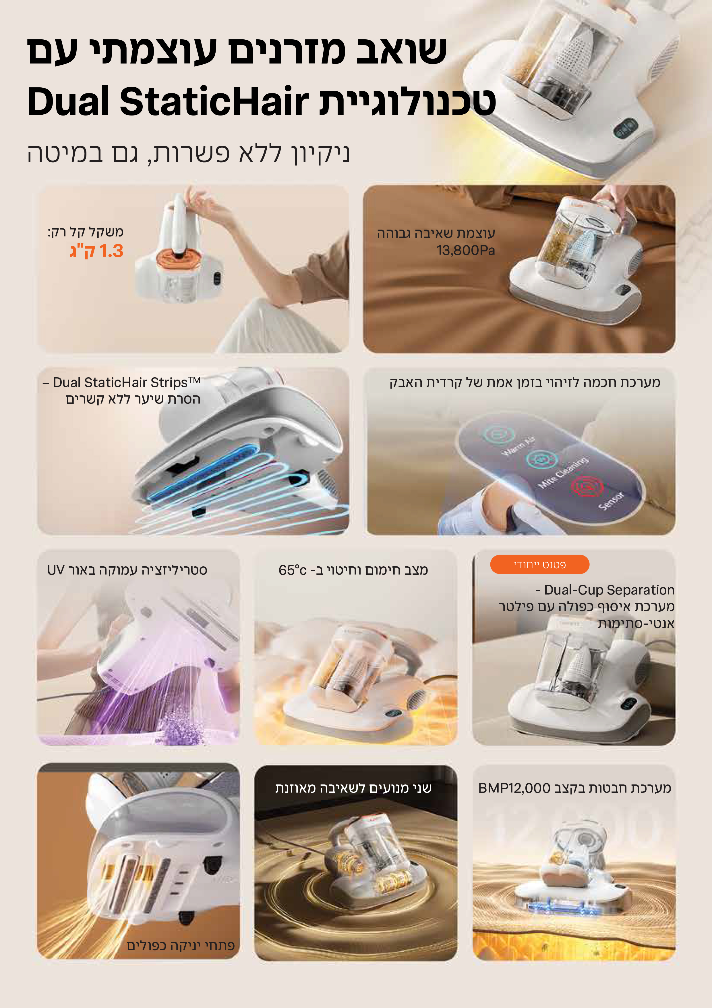 קרדית אבק וחיידקים. מערכת Patent Cup-Dual שומרת על סינון יעיל, בעוד רצועות StaticHair כפולות לוכדות